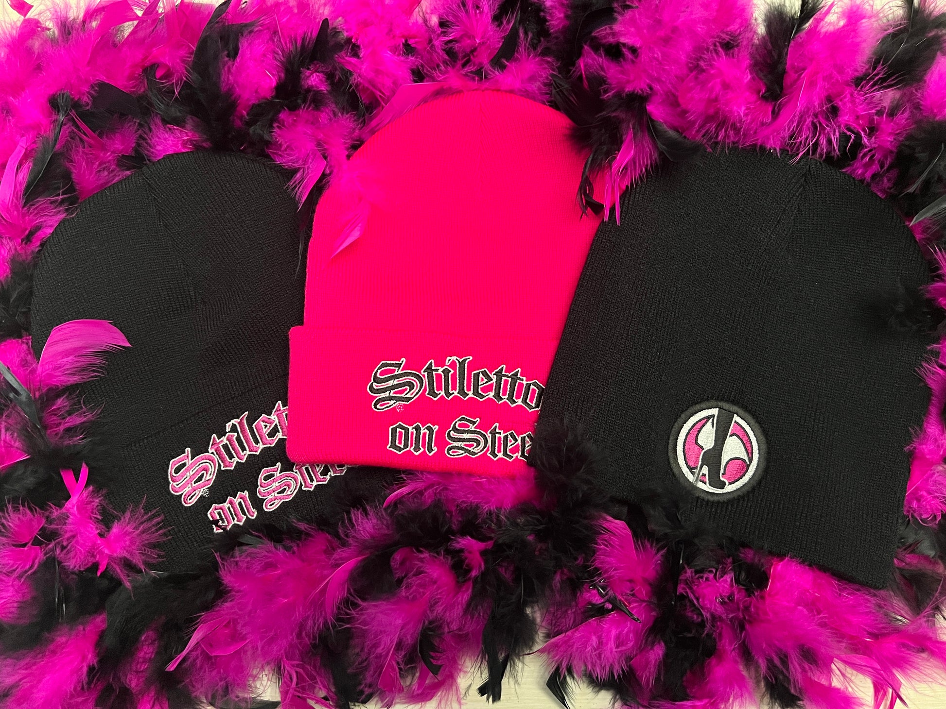 Helmet hair? Who Cares!!!! 100% acrylic knit with high-visibility, comfort and style. Over 10,000 stitches! embroidery design in hot neon pink or black.