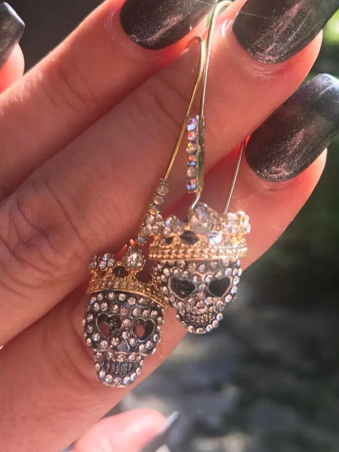 These zinc alloy crystal skull earrings by Betsey Johnson feature elongated ear wires set with stones, complemented by a sleek skull drop accented with pave stones and a regal crown design. The earrings combine gold and hematite-tone metals and secure with shepherd’s hook closures. Crafted in two-tone metal with glass elements, they measure 2.25" in length and 0.5" in width.