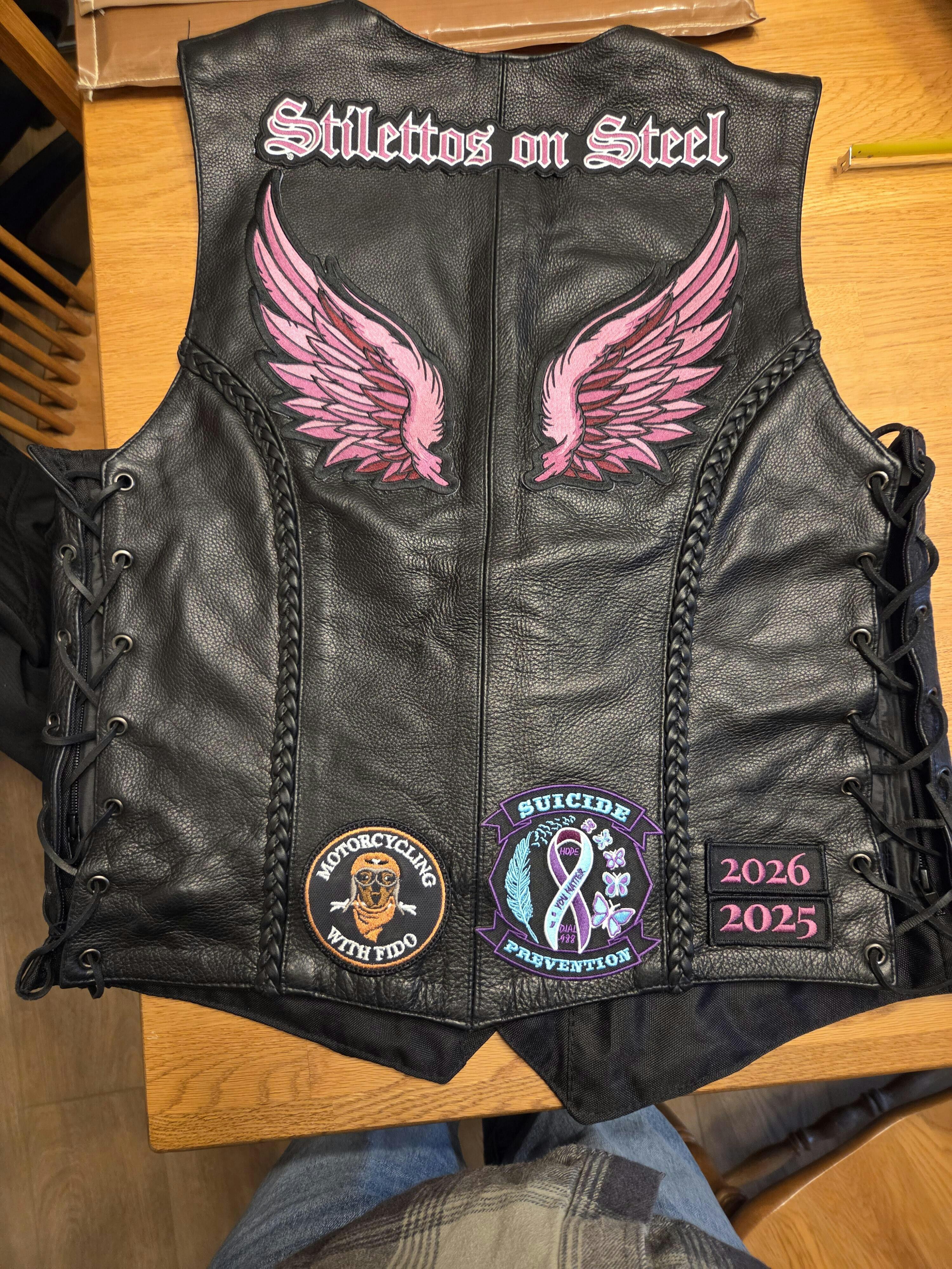 Embroidered Wing Patch Set- 2 piece patch set with a left and right wing. Embroidered custom colors and cut to shape created exclusively for STILETTOS ON STEEL. Heat sealed backing for commercial iron-on and a Merrowed edge for easy sewing application. Each wing is approximately 5.5 x 7" available in white or pink