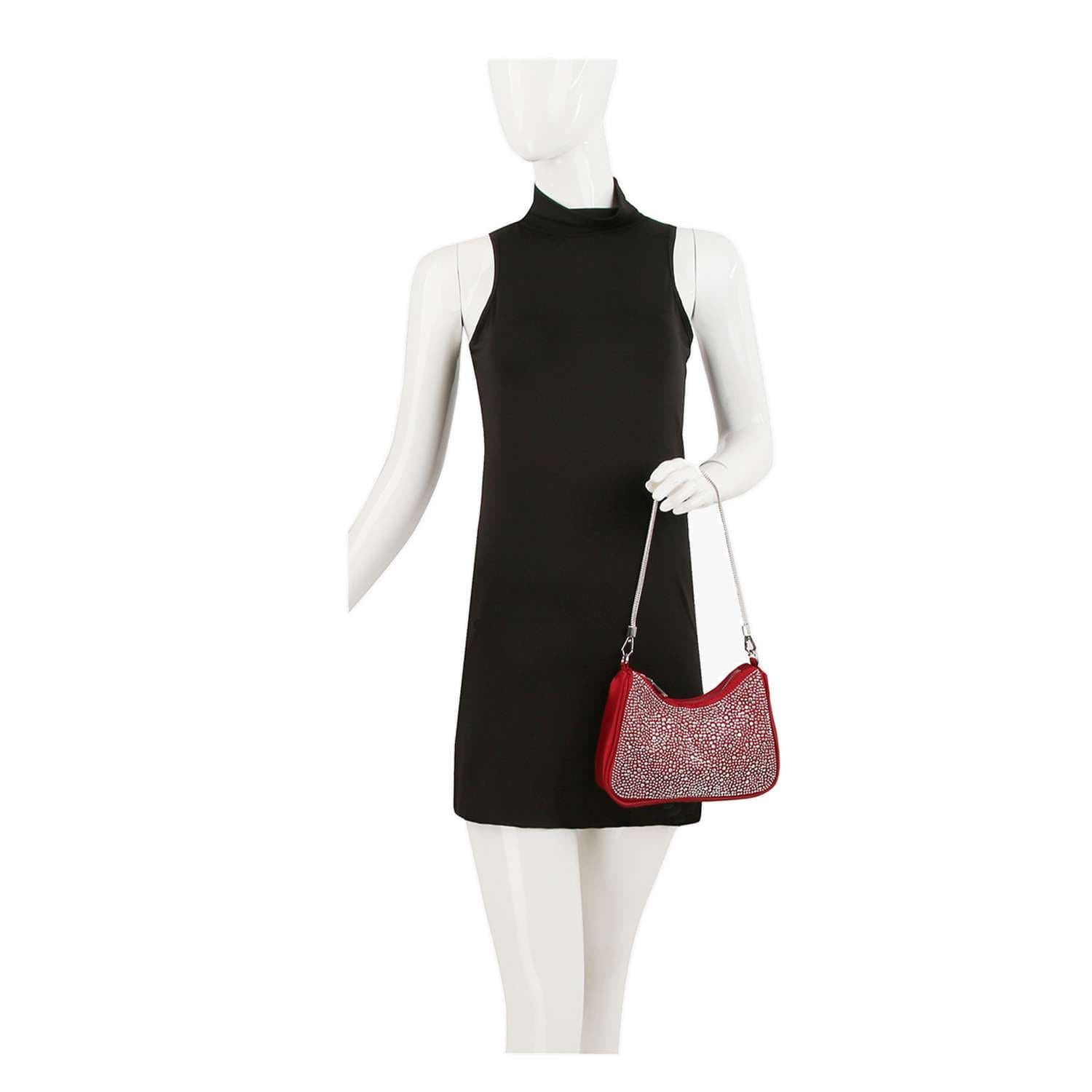 A stylized handle long enough to go over the shoulder ensures a comfortable carry in this sparkling stone hobo furnished with plenty of pizazz. 11.5L detachable strap. 2 interior slip pockets and 1 zip pocket. Top zip closure.